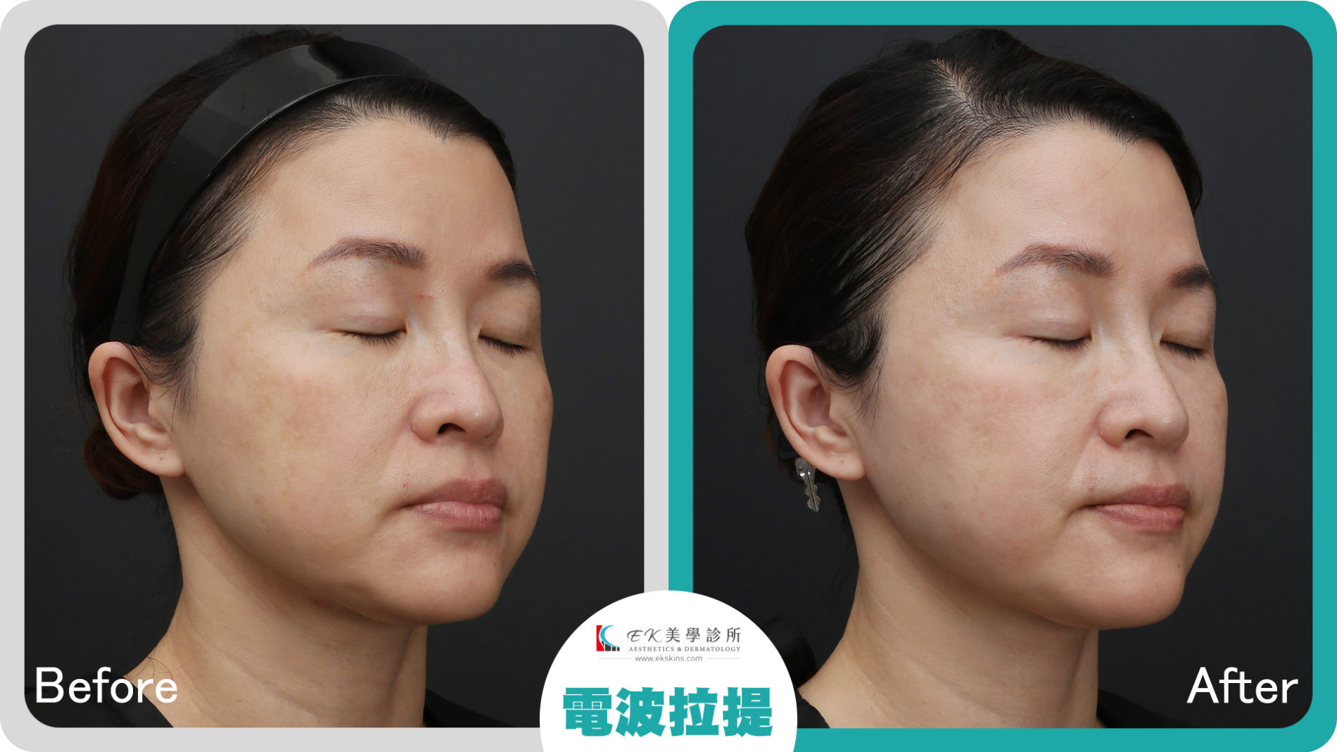 電波拉皮與音波拉提作用的的層次與效果並不相同,電波主要是通過容積式的加熱刺激膠原蛋白增生,因此作用的部位相對音波拉提來說比較廣泛也相對淺層 ,對於治療臉上的皺紋細紋、肌膚緊實、膚質優化以及下顎線拉提都有顯著的改善。